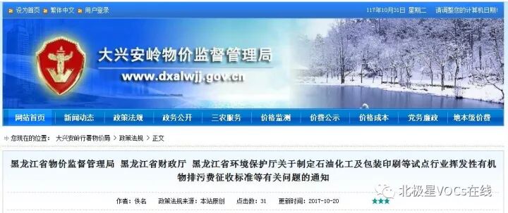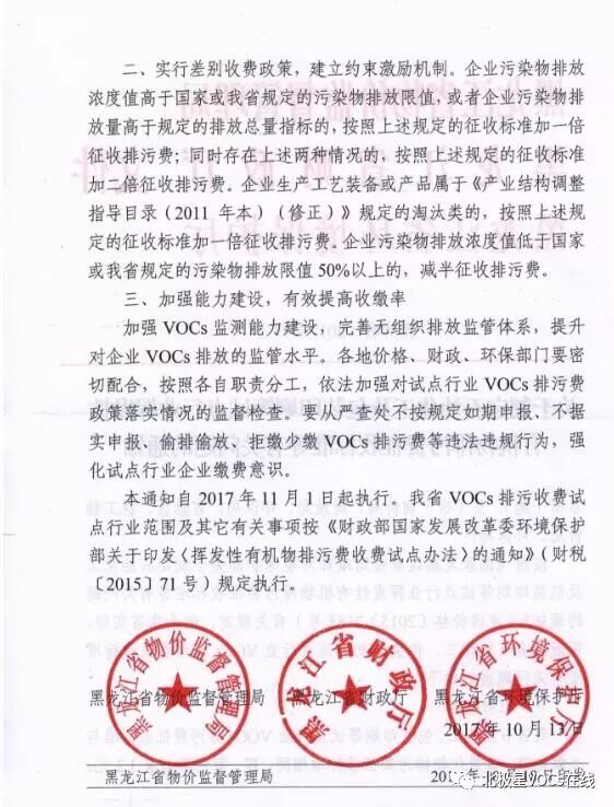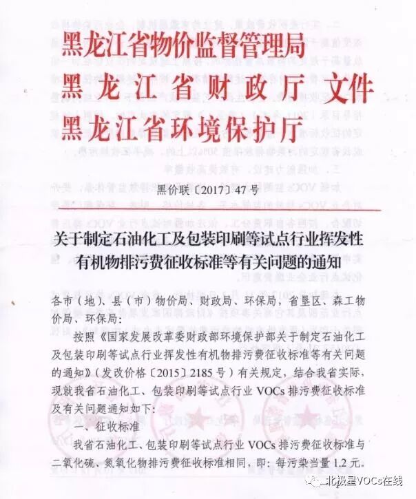 日前,黑龙江省物价监督管理局、黑龙江省财政厅、黑龙江省环境保护厅联合印发关于制定石油化工及包装印刷等试点行业挥发性有机物排污费征收标准等有关问题的通知。黑龙江省石油化工、包装印刷等试点行业VOCs排污费征收标准与二氧化硫、氮氧化物排污费征收标准相同,即:每污染当量1.2元。自2017年11月1日起执行。全文如下: